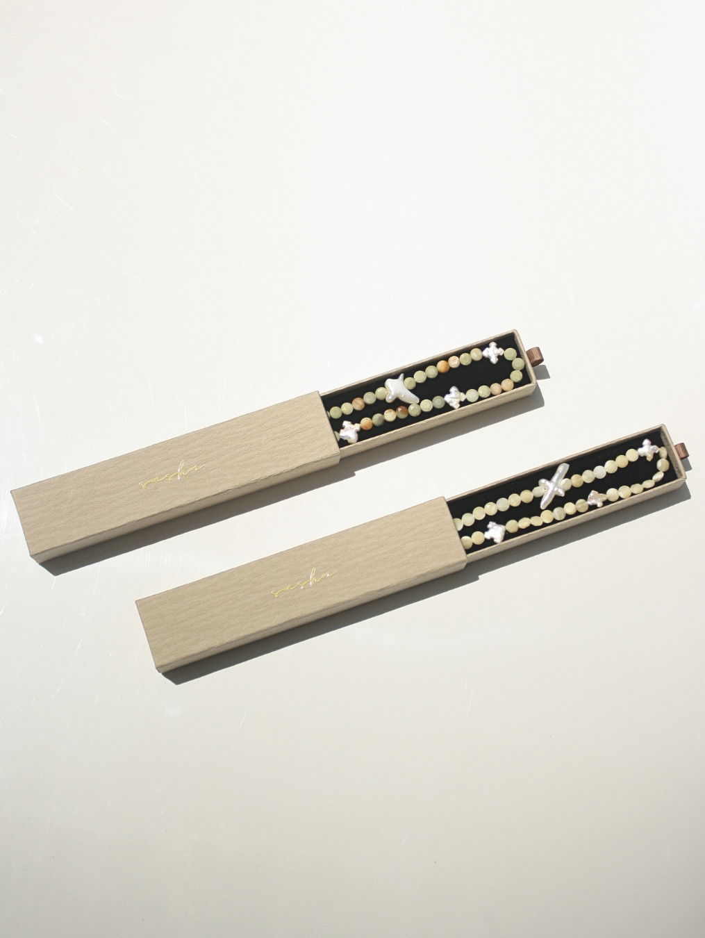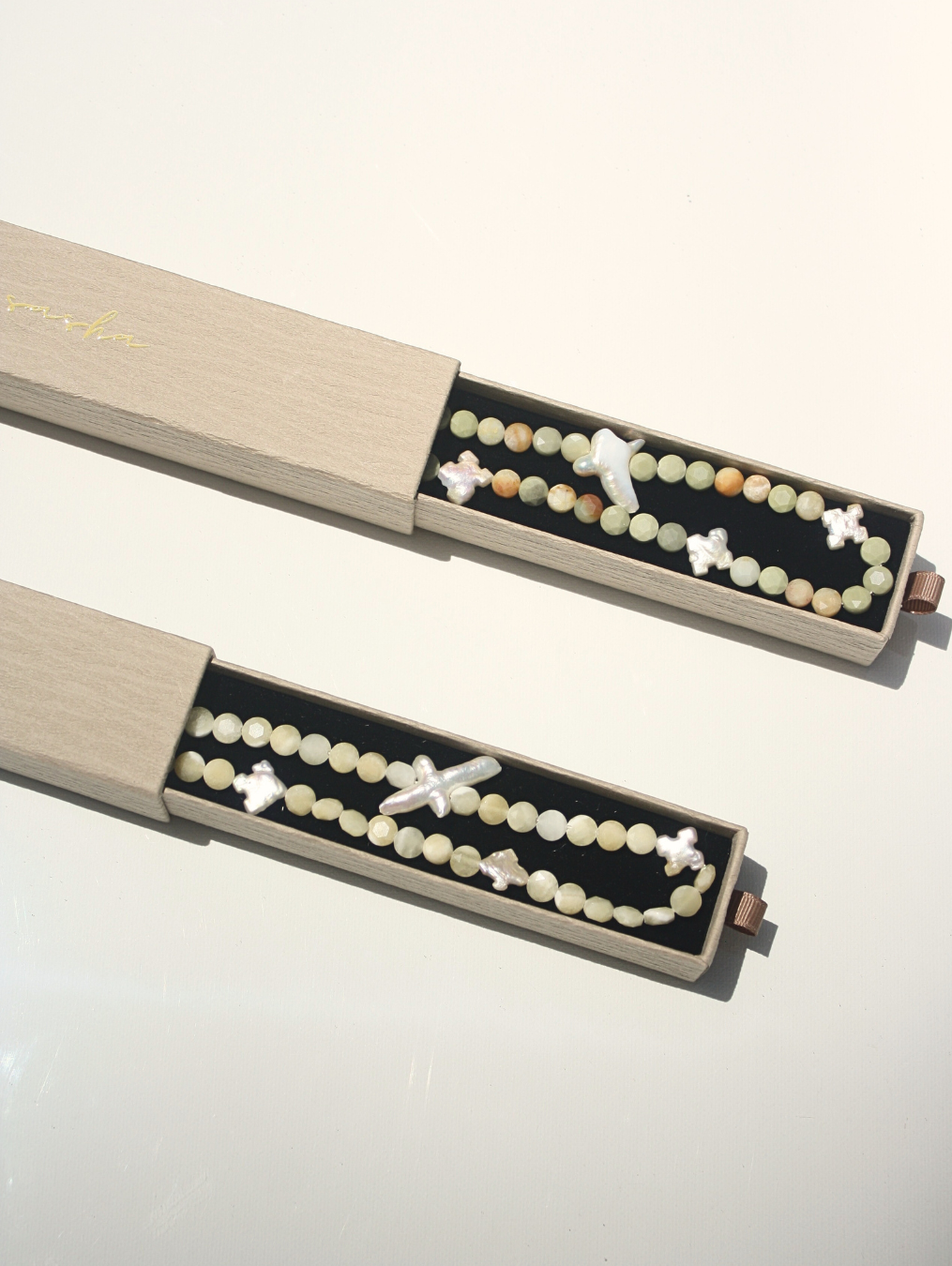 Each necklace is one of a kind, with natural variations visible across the beads and pearls.
