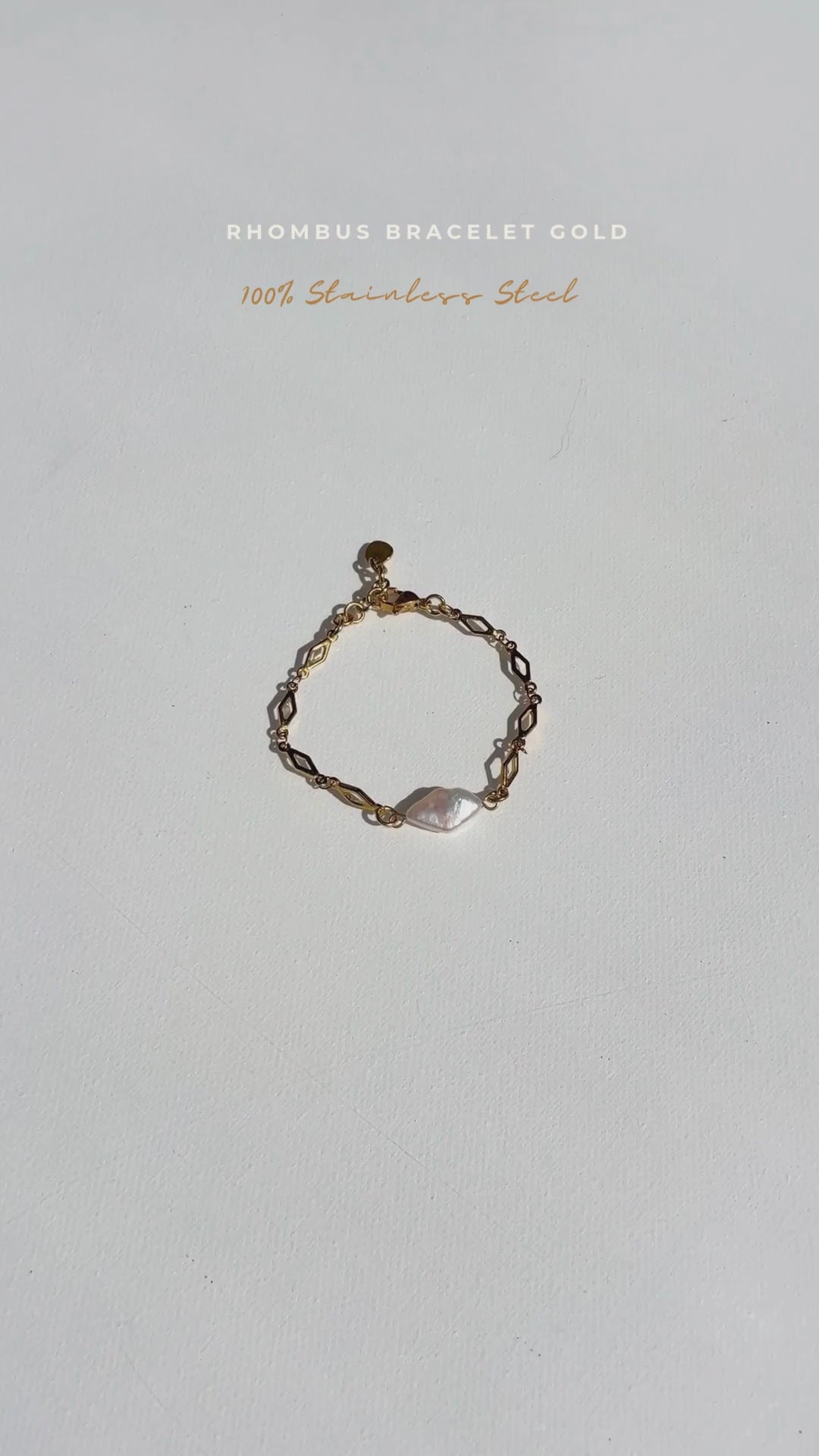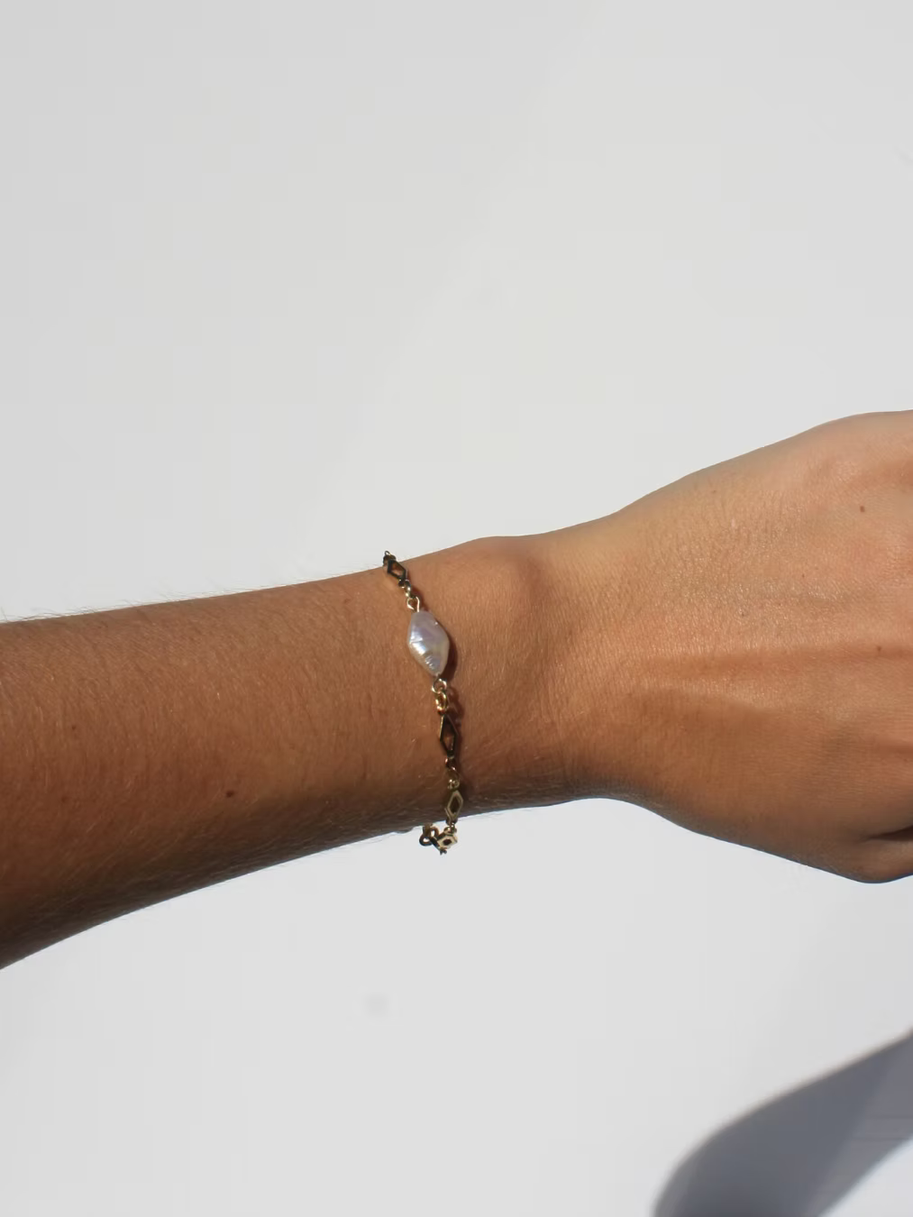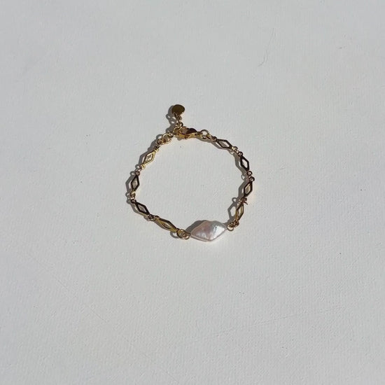 This limited edition bracelet features a delicate rhombus-shaped golden chain, finished with a single organic keshi pearl suspended at its centre. Each pearl is completely unique in shape and texture, celebrating natural beauty and individuality.